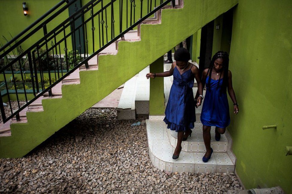 Two young women are seen ahead of a welcoming ceremony for first year students on February 3, 2018 in Beni.Image copyrightAFP